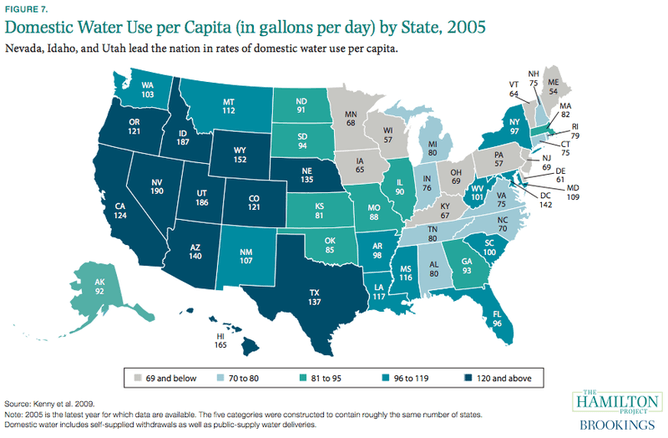 This solution would not even require much change in the way water is already billed. Typically, water usage is billed at three tiers of usage. For example, in Bakersfield, the price of water is as follows: US$1.66 per 100 cubic feet of water for the first 1,300 cubic feet used, US$1.80 per 100 cubic feet of water for the next 2,100 cubic feet used, and US$2.09 for every 100 cubic feet of water used after that (a cubic foot of water is roughly 7.48 gallons).