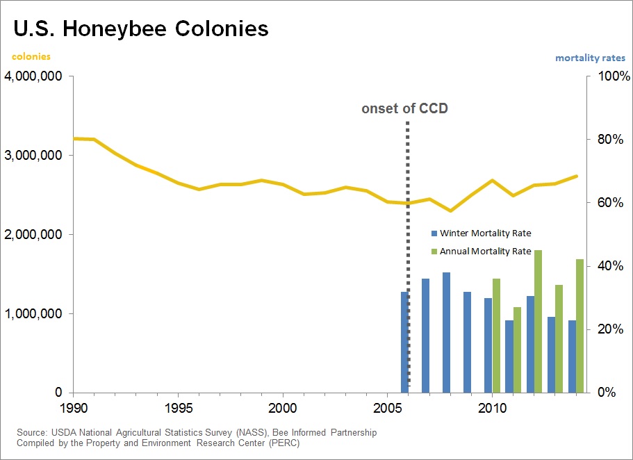 Almost no one has reported this, but it’s true. You can browse the USDA reports yourself. Since colony collapse disorder began in 2006, there has been virtually no detectable effect on the total number of honeybee colonies in the United States. Nor has there been any significant impact on food prices or production.
