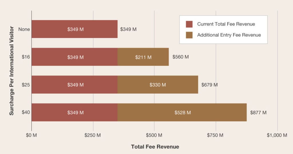 Current fee revenues across all national parks total $349 million. Under the scenarios examined, adopting a surcharge paid by each international visitor to a national park site would raise that total to an estimated $560 million to $877 million, an increase from current levels of 61 percent to 151 percent, respectively.