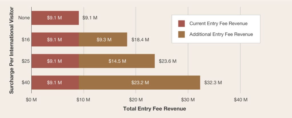 Note: Estimates assume that each surcharge, whether $16, $25, or $40, would decrease visitation from international tourists by 3 percent, based on existing research that demand for visitation to high-profile U.S. national parks is extremely inelastic. See, for example, Thomas H. Stevens, Thomas A. More, and Marla Markowski-Lindsay, “Declining National Park Visitation: An Economic Analysis,” Journal of Leisure Research 46, no. 2 (2014), and Jeremy L. Sage et al., “Thinking Outside the Park: National Park Fee Increase Effects on Gateway Communities,” University of Montana Institute for Tourism and Recreation Research, Report 2017-11 (2017).