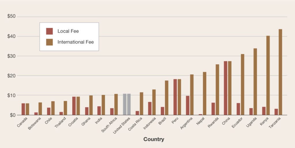 A 2019 report that reviewed entry fees at national parks around the world found approximately three dozen nations that charge non-citizens more than citizens.48National Park Entrance Fees, Van Zyl, Kinghorn, and Emerton. The strategy allows park systems to benefit from foreign visitors’ ability and willingness to pay, particularly in relatively lower-income countries. Additionally, for countries that receive a high share of visits from international tourists, the approach ensures that taxpayers do not bear an outsized burden of funding those visits. Many park systems explicitly state that fee revenue is dedicated to funding operations and stewarding natural resources in parks. Figure 3 displays fees paid by local and international visitors to national parks in selected countries, including the United States.49Table 1 in the Appendix provides a full list of local and international entry fees for countries included in the report.