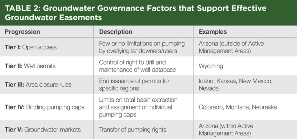 The tiers in Table 2 describe a progression of governance factors that contribute to groundwater easement success, ranging from open-access basins (Tier I) to basins with active groundwater markets (Tier V). In basins that require well permits (Tier II), individual water users are permitted to use a certain amount of groundwater for specific purposes. Some basins also have area closure rules (Tier III), which ensure that an individual with an existing permit can pump a specified amount and that no new entrants can reduce that amount by drilling a new well. Basins can also enact binding pumping caps (Tier IV), which limit the amount of water pumped from specific wells. In addition to these governance factors, some basins also have functioning groundwater markets (Tier V) that allow for the transfer of pumping rights.