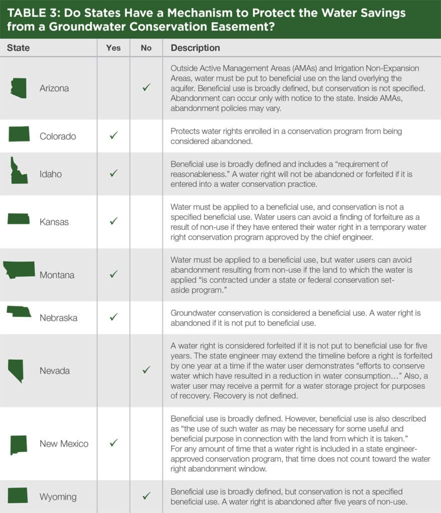 Table 3 reports whether states have abandonment or beneficial-use policies that allow for groundwater conservation easements to effectively conserve groundwater. There is significant variation in these policies across states. For example, while some states such as Wyoming have no legal mechanism to protect a groundwater easement’s water savings, other states such as Colorado and Kansas protect water rights that are enrolled in a conservation program from abandonment claims. Like in Colorado, Kansas law states that a water right will not be considered abandoned if the right is included in a conservation program established by the state’s chief engineer. However, the Kansas statute specifies that an approved conservation program shall not exceed 10 years, which might create conflict given that conservation easements create permanent restrictions.38Kan. Stat. Ann. 82a-718(d), 82a-741. On the other hand, Idaho generally limits beneficial use to agriculture, domestic use, manufacturing, mining, and hydropower.39Idaho Const. Art. XV, § 3; Idaho, Dep’t of Parks v. Idaho Dep’t of Water Admin., 530 P.2d 924, 931 (Idaho 1974) (Bakes, J. concurring). Idaho water users, however, are not subject to forfeiture or abandonment for non-use if they enter their water right in a conservation practice that results in the pumping or diversion of less water than originally authorized while maintaining beneficial use of water.40Idaho Code § 42-223.