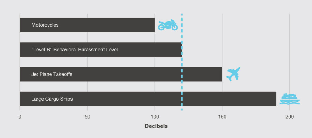 Increased shipping causes problems because sound does not travel underwater like in the air—it travels faster, for longer distances, and at louder volumes. For animals that rely on hearing more than sight, including orcas, loud noise is a constant irritant. The Marine Mammal Protection Act designates continuous noise near an orca at 120 decibels or more as “Level B” behavioral harassment, and violations can result in fines, jail time, or vessel forfeiture. For perspective, large cargo ships can emit up to about 190 decibels of noise, even louder than a plane taking off.