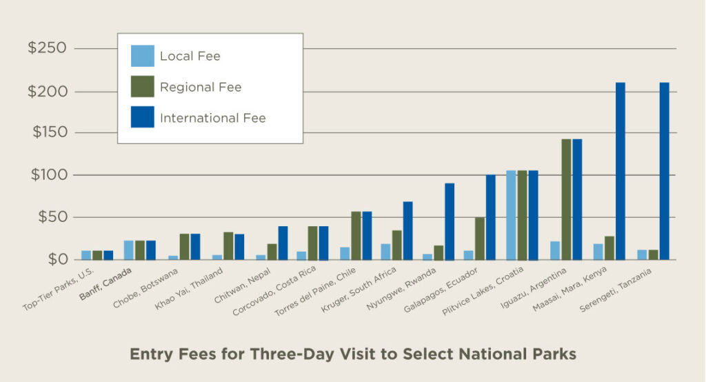Roughly 14 million international visitors frequent U.S. national parks annually, yet they pay the same entry fees as domestic visitors, even though their ability and willingness to pay are generally higher. This approach misses an opportunity to link park funding more closely with visitation demand—and adopt a strategy common at national parks in other countries around the world. Furthermore, the current fee structure does not account for variability in visitor profiles, trip costs, or the strain on park resources caused by different groups.