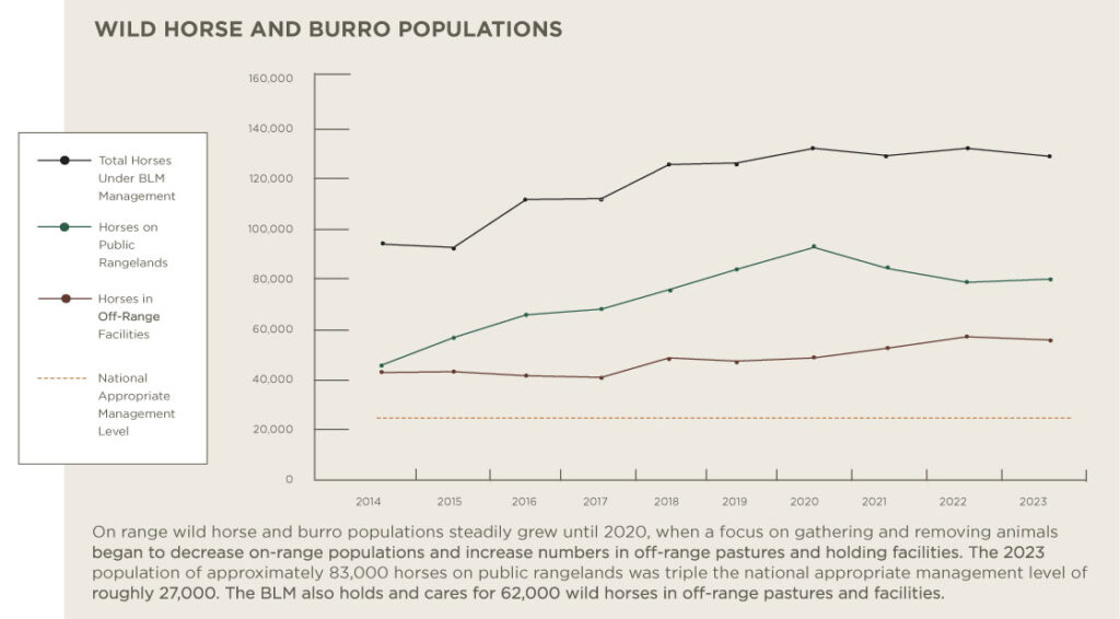 In 1971, Congress directed the Bureau of Land Management to protect wild horses and burros and maintain sustainable populations of them. Today, their numbers on public lands are nearly triple the agency’s threshold, leading to overgrazing, habitat degradation, and displacement of species like sage grouse and elk. Tens of thousands more horses are kept in off-range facilities, costing taxpayers over $100 million annually.