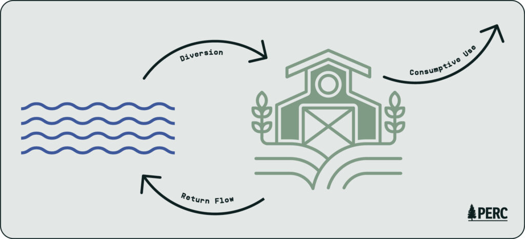 Water use is often described in terms of diversion, consumptive use, and return flow. Diversion refers to the amount of water removed from a river, stream, or canal. Consumptive use is the amount of diverted water that does not return to the water system because it is applied to a field and then either absorbed by crops or the soil or evaporates. Return flow describes the amount of water that is diverted and applied but then flows back into the stream.