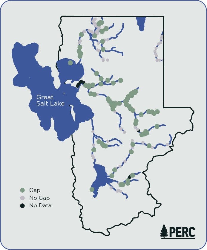 This map, inspired by Lukens et al. (2024), shows the existing gaps in measurement and monitoring in the Great Salt Lake Basin. Based on their analysis, they identified locations where measurement could be improved (gap) and where current methods were sufficient (no gap) to help with shepherding, along with other diverse objectives.
