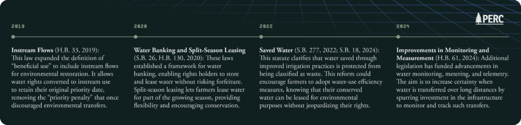 Utah has taken a number of steps to encourage voluntary solutions that work collaboratively with the agricultural community. The state has overhauled several of its water laws to discourage waste and reduce barriers to leasing water for environmental flows (see Box 1). Utah’s water rights system is governed by the prior appropriation doctrine, often summarized as “first in time, first in right.” This legal framework prioritizes older (senior) water rights over newer (junior) ones and requires water to be put to “beneficial use,” historically defined as irrigation or municipal uses. Traditionally, a rights holder who did not put all of their allotted water toward such uses could risk forfeiting a portion of their allotment. Such “use it or lose it” rules often discouraged water conservation, as farmers had no incentive to leave water in streams or adopt more efficient irrigation methods.
