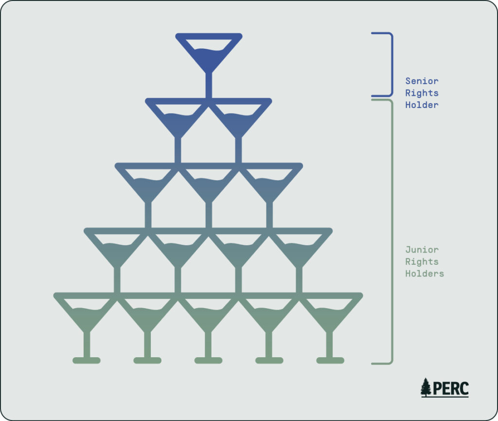 Prior appropriation allocates water through time, not space. Think of it like a champagne tower: The top glass represents the most senior water right, and each lower tier represents more junior rights. Champagne (water) gets poured into the top glass first, and only once it overflows does it reach the next level. But under prior appropriation, the most senior right gets satisfied first, no matter where the rights are located.