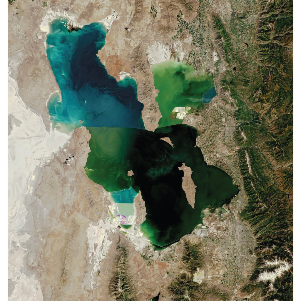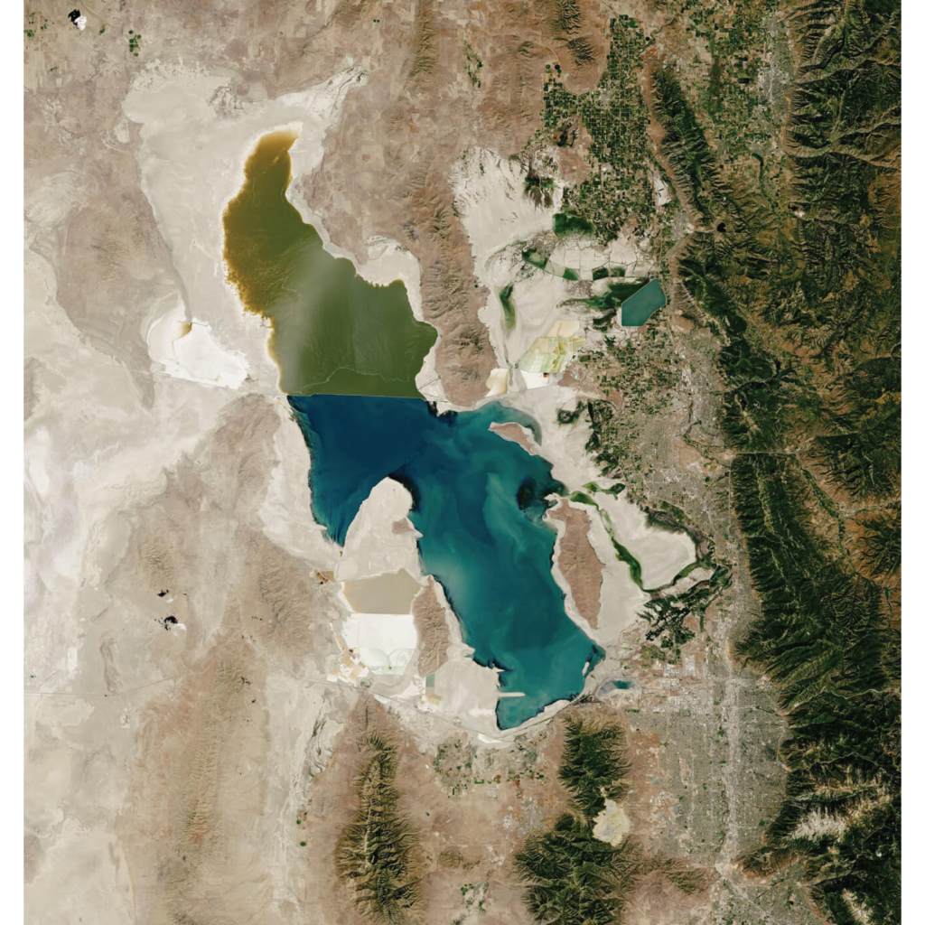 The Great Salt Lake has lost 60 percent of its total surface area. Each color represents a significant change in the lake’s perimeter, with the deepest blue representing the largest it has been and the beige showing its current, smallest boundary.