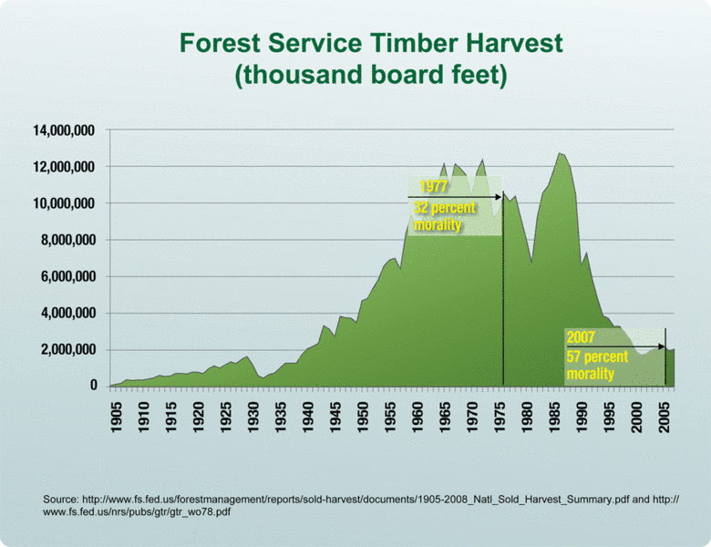 During the peak of timber harvest for the Forest Service, more than half the annual timber growth was harvested and used for timber products, the mortality rate was about 32 percent. In 2007, only 12 percent of national forest growing stock was removed from the forest and mortality increased to 57 percent.