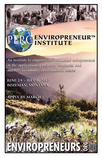 PERC is accepting applications right now for their 2012 Enviropreneur Institute. Not a day goes by when I’m not amazed at how my experience at PERC directly impacts my day-to-day work. I have a network of peers and mentors to advise me, and I have been fortunate to receive ongoing support from PERC, including for the workshop “Market Approaches to Coral Reef Restoration: Investigating the Viability” that I co-directed with them in Florida and that led to the article in Nature.
