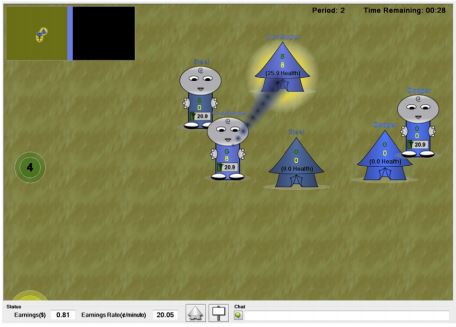 Here’s how it worked: Each PERC participant was provided a laptop and given instructions on how to navigate a virtual world resembling early human agricultural settlements. Players must harvest renewable resources—either green or yellow patches—to maintain a health rating. Each colored patch has a numerical value. The more health earned throughout the game, the more reward paid at the end of the experiment. The game is divided into “weeks” in which players can harvest and consume one resource per week.