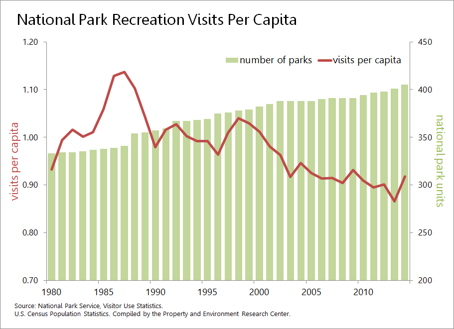This decline is even more pronounced once we consider the growth of the National Park System. Since 1980, more than 70 national park units have been added to the National Park System. Yet these additional parks do not seem to be attracting more overall visits per capita.