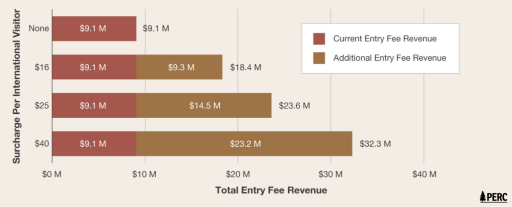 Note: Estimates assume that each surcharge, whether $16, $25, or $40, would decrease visitation from international tourists by 3 percent, based on existing research that demand for visitation to high-profile U.S. national parks is extremely inelastic. See, for example, Thomas H. Stevens, Thomas A. More, and Marla Markowski-Lindsay, “Declining National Park Visitation: An Economic Analysis,” Journal of Leisure Research 46, no. 2 (2014), and Jeremy L. Sage et al., “Thinking Outside the Park: National Park Fee Increase Effects on Gateway Communities,” University of Montana Institute for Tourism and Recreation Research, Report 2017-11 (2017).