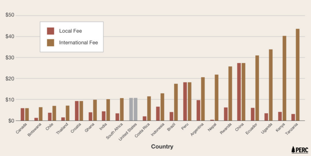 As many U.S. parks are facing record visitation and struggling through funding shortfalls, the idea of charging international visitors more than domestic ones has gained traction. The National Park System Advisory Board has suggested that differential pricing based on residency could be a way to increase park revenue, noting the success of that strategy in other nations.12 Rob Hotakainen, “Foreign Visitors Could Face Higher Entry Fees,” E&E News, January 8, 2021. Additionally, the late Sen. Mike Enzi (R-Wyo.) pushed in 2019 to legislatively implement a surcharge for overseas visitors to help fund national parks by raising tourist travel and visa fees by $16 and $25, respectively.13The proposal also called for the fees to be adjusted for inflation over time. Responsibly Enhancing America’s Landscapes Act, S.2783, 116th Cong. (2019); Tate Watkins, “Enhancing the Public Lands Recreation Fee System,” PERC Policy Brief (2020): 7-8.