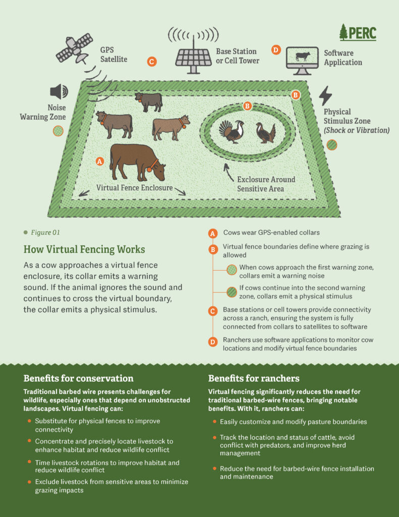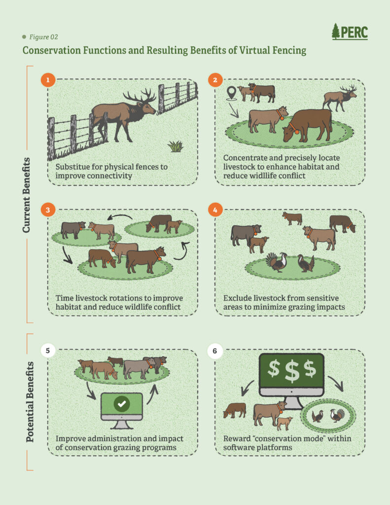 Livestock grazing on rangelands is highly compatible with robust wildlife populations. Supporting working rangelands and their stewards, while also working to improve practices with conservation in mind, is a win-win for all. Conservationists have an opportunity to catalyze the adoption of virtual fencing, a transformative technology that maintains the boundaries necessary for successful livestock operations, while also unlocking a number of new conservation benefits. Virtual fencing can improve conservation outcomes by reducing the need for physical infrastructure, concentrating and locating livestock, excluding livestock from sensitive areas, and timing grazing rotations to increase flexibility and habitat heterogeneity. Applied as a broader conservation tool, virtual fencing could potentially automate conservation via a “conservation mode” within virtual fencing software to reduce monitoring, reporting, and verification burdens for conservation grazing programs.