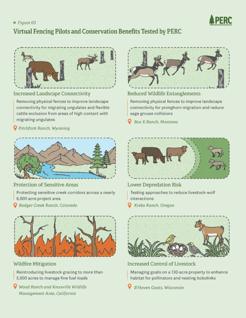 How can the conservation community accelerate the use of virtual fencing as a transformative conservation tool? Virtual fencing’s conservation potential will not be fully achieved unless it is first and foremost widely accepted and adopted in the ranching community, and ranching as a livelihood is economically successful and durable across generations. Adoption at scale depends on ranchers first trusting the technology. To achieve this, conservation groups can act as honest brokers, sharing successes as well as lessons learned and limitations. Conservation groups can also use their networks to convene conversations among producers, allowing peer-to-peer learning opportunities. Widespread adoption is important not only because it has direct conservation benefits, but also because it makes innovative conservation uses, such as new pay-for-practices programs, much easier and cheaper if virtual fencing is already used by a particular producer—or, better yet, an entire landscape of producers. For example, if a producer is already using virtual fencing, they may be more likely to think about enrolling in a conservation organization’s riparian-exclusion compensation program; likewise, if virtual fencing is widespread, a conservation organization seeking to develop such a compensation program would face lower costs and improved impact reporting. Essentially, promoting adoption of virtual fencing within the ranching community can become an effective conservation strategy, as can actively working to overcome barriers to adoption, whether related to lack of trust, learning challenges, lack of efficacy, or economic, social, and policy or legal barriers. Going further, conservation organizations or agencies can incentivize changes in grazing practices by providing virtual fencing access and technical assistance in exchange, as PERC is piloting in our Conservation Innovation Lab (Figure 3).
