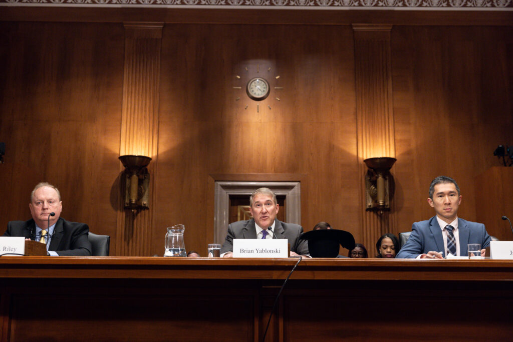 PERC CEO Brian Yablonski testifies before the Senate’s Environment and Public Works Subcommittee on Fishing, Water, and Wildlife. Thomas Riley, water resources and environmental consultant, Riley Consulting (left) | Jake Li, vice president of conservation policy, Defenders of Wildlife (right). Photo courtesy of Anna Rose Layden.