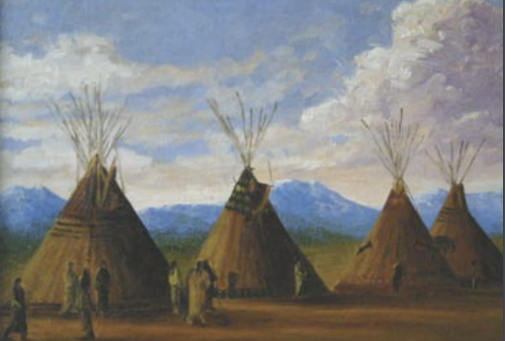 Blackfeet Gathering, an oil painting of teepees, illustrates private property among American Indians. It is available by auction.